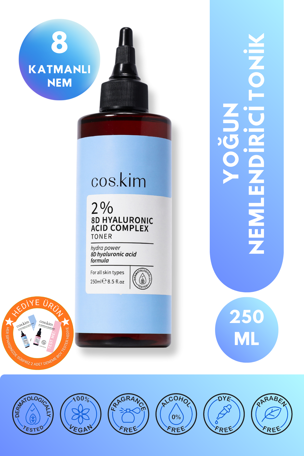Cildinizin farklı katmanlarına derinlemesine nem sağlayan Cos.kim %2 8D Hyaluronik Asitli Tonik, 8 çeşit hyaluronik asitten oluşan kompleksiyle yoğun nem ve dolgun cilt etkisini bir arada sunar. Günlük kullanım için ideal bu cilt nemlendirici tonik, özellikle hyaluronik asit tonik / hyaluronik asitli tonik arayanlar için geliştirilmiştir. Alkolsüz tonik ve parfümsüz tonik yapısı sayesinde hassasiyet oluşturmaz; hassas ciltler için tonik arayışına da güvenle yanıt verir.